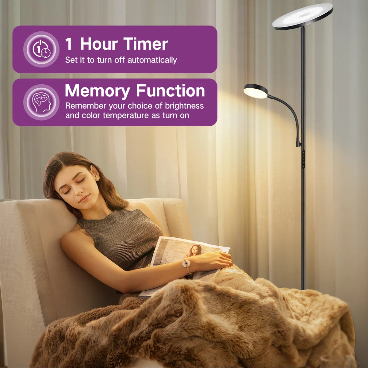 - Super Bright & Different Functions: Built-in 126+28 high brightness LEDs, up to 2400+400 lumen step-less dimming standing lamp is enough to light up your living room. The 27W main torchiere lamp effortlessly brightens up the entire room and the 7W side lamp with a flexible gooseneck can be freely adjusted to different directions, perfect for any task, such as reading, working, or sewing.
